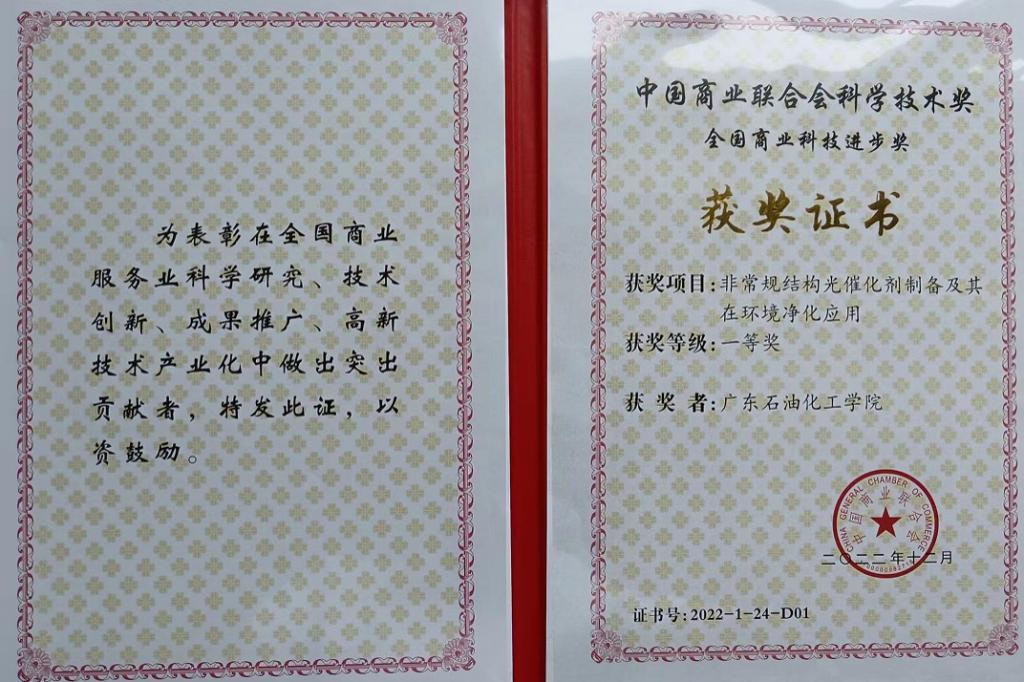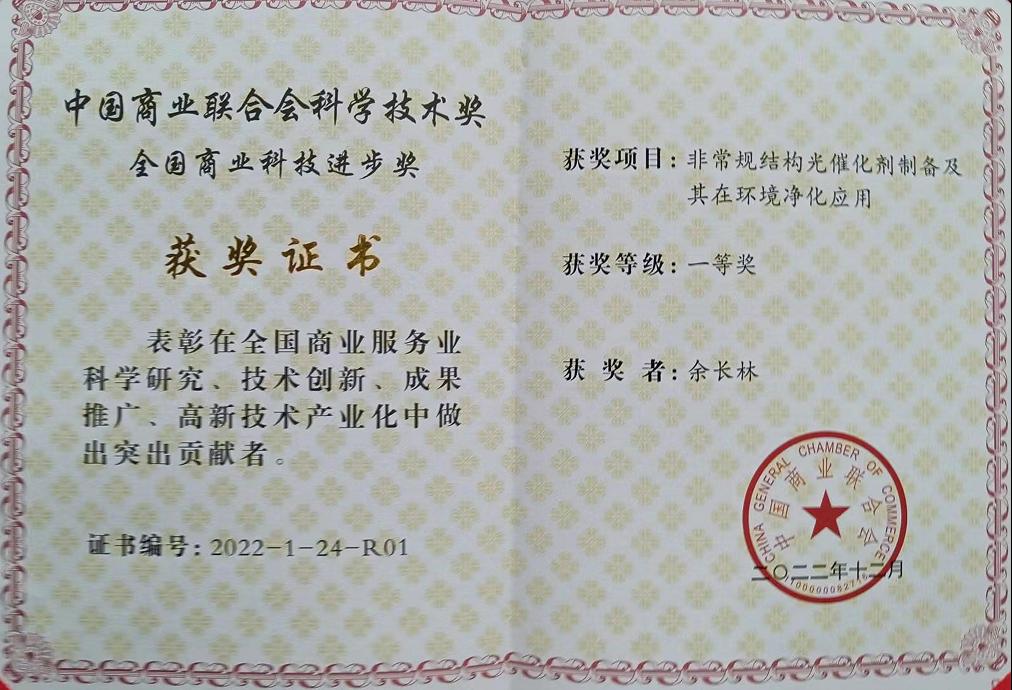 大会颁发了2022年中国商业联合会科学技术奖、第十四届中国商业联合会服务业科技创新奖等奖项。我校化工学院余长林教授团队主持完成的科技成果《常规结构光催化剂制备及其在环境净化应用》,获全国商业科技进步奖一等奖。该成果广东石油化工学院为第一完成单位,杭州楚环科技股份有限公司为第二完成单位。该项目成果获15件授权中国发明专利,11件实用新型专利,国际PCT专利1件;在科学出版社等出版了《声化学及其在纳米材料制备中的应用》等专著编著5部;在Advanced Materials等发表论文200余篇。项目实现了光催化剂和化学洗涤、生物过滤等技术集成,在废气除臭、石化VOCs、印染、化纤和制药废水污染物的深度去除上进行了工业应用,取得了较大的经济社会效益。