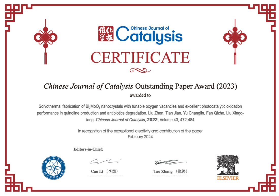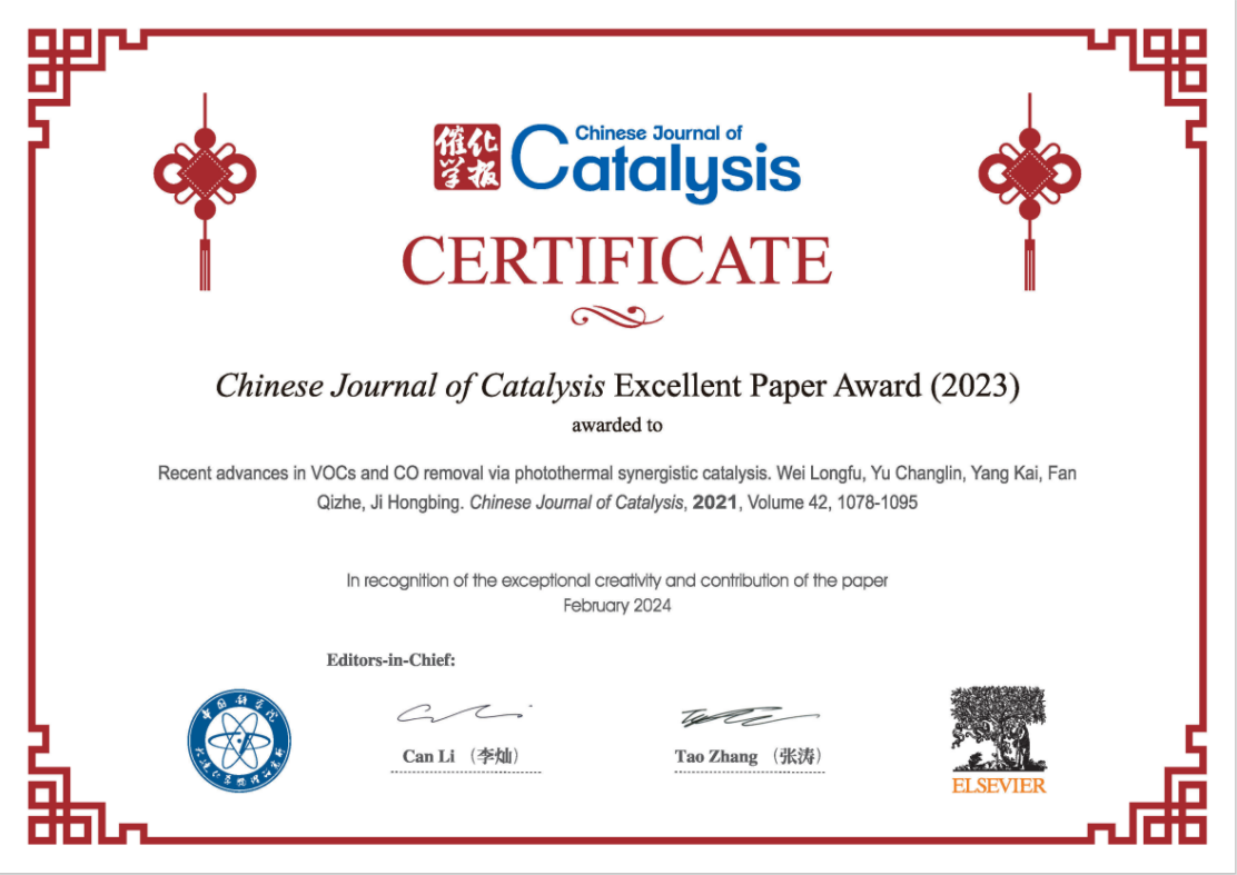 近日,我院余长林教授两篇学术论文(Solvothermal fabrication of Bi2MoO6nanocrystals with tunable oxygen vacancies and ecellent photocatalytic oxidation performance in quinoline production and antibiotics degradation. 2022,43,472-484)和(Recent advances in VOCs and CO removal via photothermal synergistic catalysis. 2021,42,1078-1095)入选2023年Chinese Journal of Catalysis(《催化学报》)杰出论文奖及优秀论文奖,两篇论文均入选ESI全球Top1%高被引论文,余长林教授为通讯作者,广东石油化工学院为第一单位。