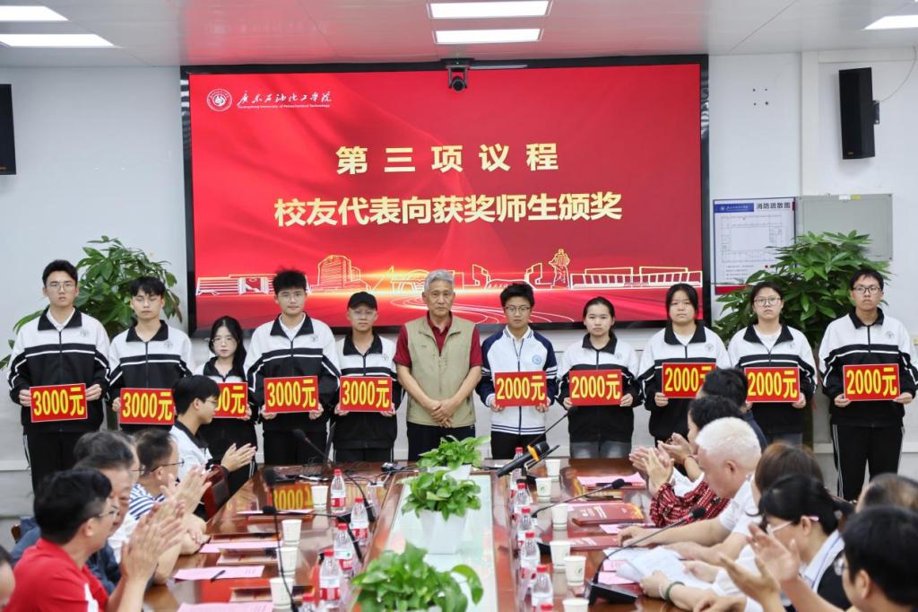 颁奖仪式上,长河集团董事长赵文海宣读“广油炼十五教育基金”表彰决定。校友代表分别向获奖师生颁奖并合影留念。师生代表在发言中感谢情系母校、支持学校教育事业发展的校友们,并表示在接下来的学习与工作中,将以“炼十五班”校友为榜样不断追求卓越,勇攀高峰。学校向“炼十五班”颁发捐赠牌匾,以表达对校友捐资助学最诚挚的谢意。