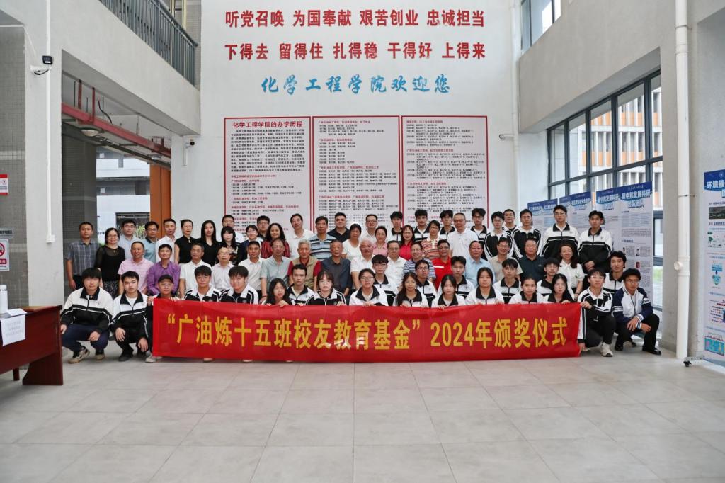 11月10日下午,在广东石油化工学院70周年校庆之际,化学工程学院在化工楼C203室隆重举行“广油炼十五校友教育基金”2024年颁奖仪式。学校党委常委、副校长周如金教授、学校党政办公室副主任、校友总会秘书长杨东娥、化学工程学院领导班子成员、广油“炼十五班”20余名校友及获奖师生代表出席了颁奖仪式。