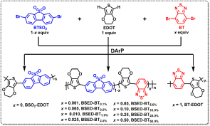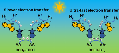 图1:C−H直接芳基化合成BT类三元共聚物光催化剂(左)及其超快电子转移途径示意图(右)