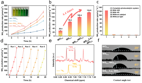 图2. WS2-x/WO2.9与WS2-x/La1-WO2.9在光催化氮固定(PNF)过程中的反应机理解析