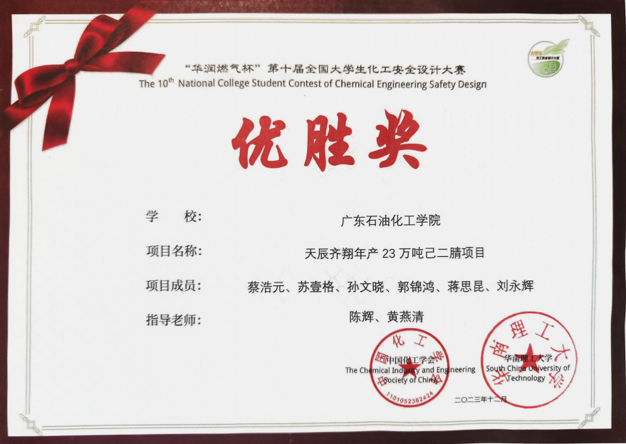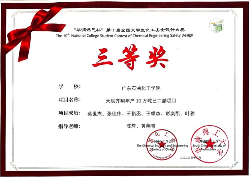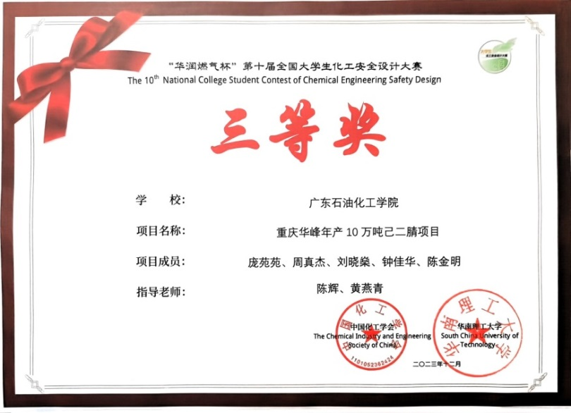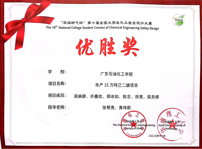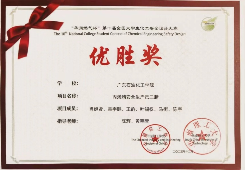 近日,“华润燃气杯”第十届全国大学生化工安全设计竞赛决赛在华南理工大学落下帷幕,我校由陈辉教授、黄燕青、张帮亮、黄伟莉老师指导的6支团队全部获奖,2项三等奖、4项优胜奖。