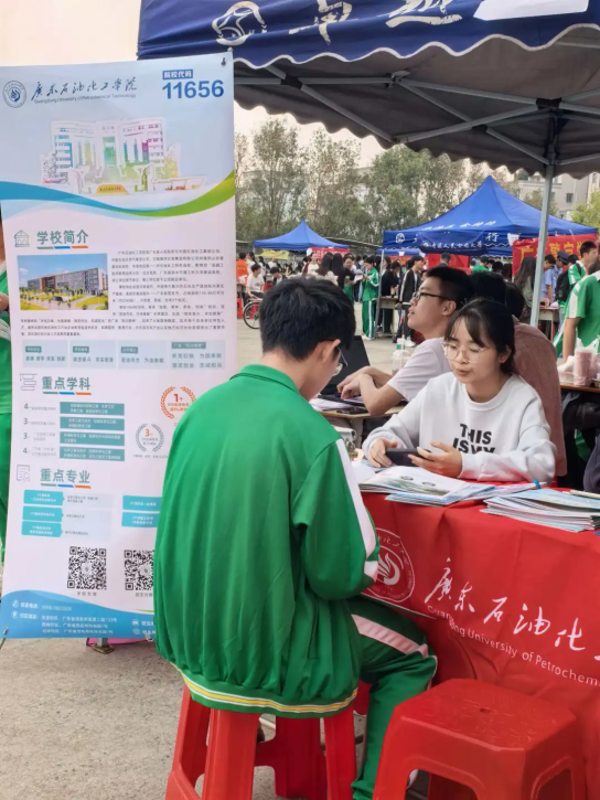 2月1日,实践队首站来到化州市第三中学,以“多媒体展示+现场答疑”的方式,全面介绍广东石油化工学院的办学历史、学科优势及化工学院的专业特色。队员们结合《广东省高考志愿填报指南》,为同学们详细讲解志愿填报技巧与注意事项,现场气氛热烈。活动还设置了互动环节,学生们踊跃提问,队员们耐心解答,并发放宣传资料,收集学生关注的热点问题,为后续精准服务打下基础。