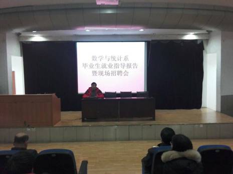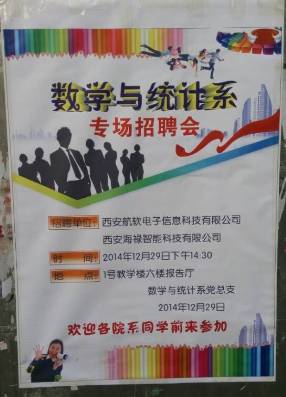 2014年12月29日下午,数学与统计系在江南校区1教学楼六楼举办了“数学与统计系毕业生就业指导报告暨现场招聘会”,招聘单位有西安航软电子信息科技有限公司、西安海禄科技有限公司,参会人员有就业处处长丁义国、系党总支书记郭全寿、学生办公室主任马新华、辅导员王宗庆老师。数统系2015届毕业生,还有部分其他院系学生参加了此次活动。