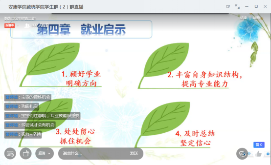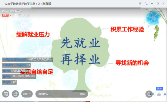 数学与统计学院把职业生涯规划教育纳入新生入学教育方案,对低年级学生早引导早规划,对高年级学生通过精准推送招聘信息、开办专场招聘会推动就业,就业指导纵向贯穿在校生四个年级;横向充分挖掘校友资源和优秀在校生资源,发挥校友、优秀在校生的辐射作用。助推了优良学风、班风的形成和保持,在全院范围营造了积极进取、勇于尝试、乐于传帮带的良好氛围。