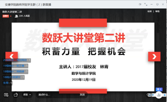 为加强对毕业班学生的就业指导,帮助低年级学生树立职业生涯规划意识,做到高年级学生有目标,低年级学生有方向,12月19日晚,数学与统计学院数跃大讲堂第二讲开讲,2017届校友林青主讲,学工办主任董婷瑜主持,我院各年级学生三百余人参加。林青是我院2013级数学与应用数学专业学生,曾在咸阳天王学校任教,目前在西安经开第二学校工作。