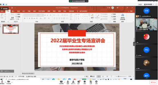 为落实国家“六保六稳”政策精神,促进我院2022届毕业生充分就业,2022年5月28日上午,数学与统计学院举办方正证券股份有限公司安康巴山路证券营业部、北京中公教育科技有限公司陕西分公司、西安新希望职业高中专场宣讲会,我院毕业班80余名学生参加了宣讲,会议由毕业班辅导员刘佩主持。