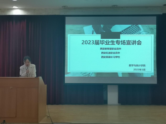 为做好我院2023届毕业生就业工作,拓宽毕业生就业渠道,我院积极与用人单位联系,搭建学生与用人单位的桥梁。2023年3月17日上午10点,数学与统计学院在1号楼六楼报告厅举办西安新希望职业高中、西安虹途职业高中、西安英泰补习学校专场宣讲会,我院毕业班120余名学生参加了宣讲,会议由毕业班辅导员刘佩主持。