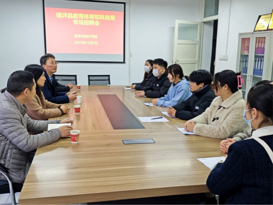 为助力2024届毕业生高质量就业,数学与统计学院于2023年12月5日在江南校区2207室召开镇坪县教体局和科技局专场宣讲会,镇坪县教体局和科技局局长朱英、镇坪高中校长杨顺、数统学院院长成波、党总支副书记杨高翔出席,有初步意向的20余名毕业生参加了宣讲会。
