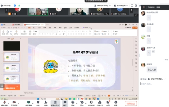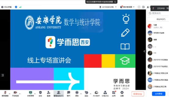 为拓宽毕业生的就业视野,促进校企合作交流,10月29日,数学与统计学院召开了学而思线上招聘宣讲会,2025届毕业生约180余人参加,会议由毕业班辅导员马勇主持。