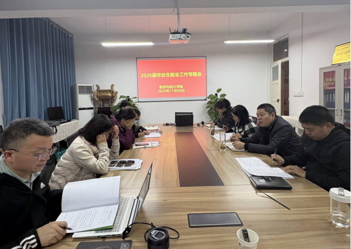 为深入贯彻落实学校关于毕业生就业工作的决策部署,科学研判就业形势,全面推进学院2026届毕业生就业工作,数学与统计学院于11月20日召开了2026届毕业生就业工作专题会。学院党政领导班子成员、系主任、就业工作办公室成员及全体教师参加会议。会议由学院副院长徐龙华主持。