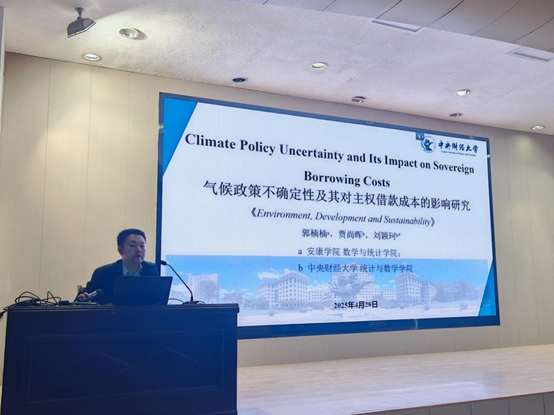 为进一步拓展师生科研视野,推动前沿学术交流,2025年4月28日下午,数学与统计学院特邀中央财经大学统计与数学学院贾尚晖教授在1号教学楼六楼报告厅做题为《气候政策不确定性及其对主权借款成本的影响》(Climate Policy Uncertainty and Its Impact on Sovereign Borrowing Costs)的学术报告。此次报告吸引了来自学校数学与统计学院、经济与管理学院的百余名师生参加,报告会由学院科研副院长杨高翔主持。