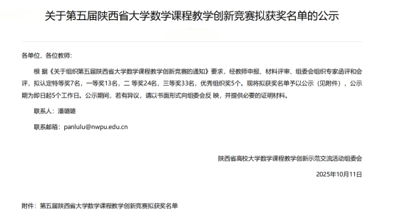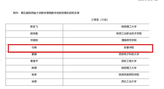 近日,第五届陕西省大学数学课程教学创新竞赛获奖结果公布,我校数学与统计学院青年教师马艳喜获竞赛三等奖。