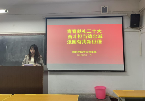 为进一步落实“四史”学习教育,加强对学生党员和入党积极分子的理想信念教育,号召大家以实际行动铸魂筑梦、喜迎二十大,2022年5月11日晚,数统院学生党支部组织学生党员、入党积极分子、发展对象40余人在2203教室开展“青春献礼二十大,奋斗担当铸忠诚,强国有我新征程”视频学习和交流讨论活动。