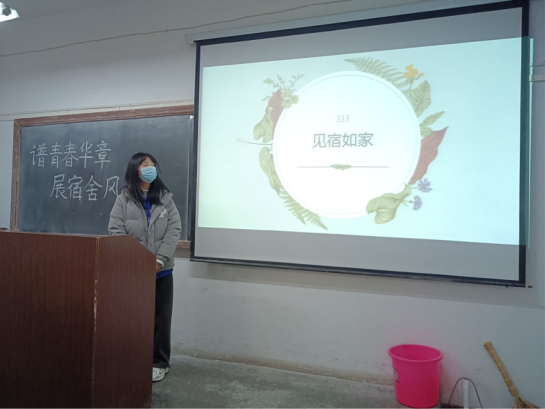 活动主要包括三个环节:宿舍安全视频拍摄、宿舍卫生评比、宿舍文化展示答辩,共计三十余间宿舍参与了活动。参赛宿舍围绕用电安全、疫情防控等方面、防火防盗等方面拍摄视频,充满“网言网语”的视频使同学们在参与拍摄过程中体会到了宿舍安全的重要性活动第二阶段,数统学院党总支书记郭全寿带领辅导员董婷瑜、刘佩、马勇多次深入各个宿舍,了解同学们的学习、生活状态,同时对宿舍环境、卫生等进行实地评分。12月2日,我院在1203室开展宿舍文化展示答辩,各参赛宿舍对本宿舍成员、宿舍公约、宿舍学风等各方面的宿舍文化进行了详细展示。