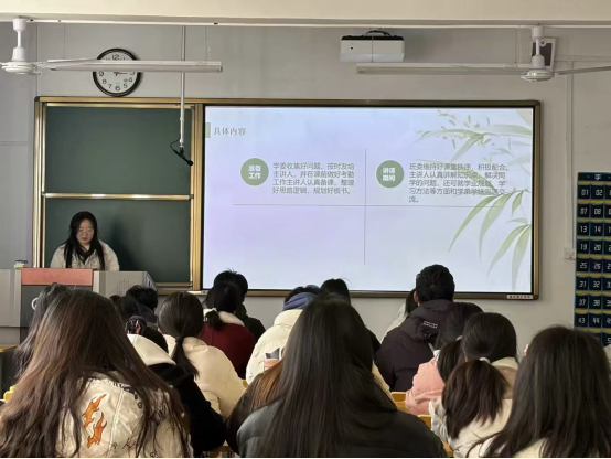 董婷瑜对数励破茧”特色工作做了系统介绍,并对2023级主讲人、2024级班委提出了明确工作要求。2025年度负责人杨碧莲梳理了工作排班,讲解了“每周一讲”、“每日一题”相关工作的注意事项。