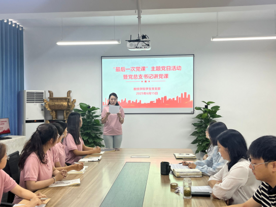 为深入学习贯彻中央八项规定精神,强化党员身份意识和纪律规矩观念,激励毕业生党员在新征程上担当作为,同时教育引导广大积极分子和发展对象坚定理想信念,奋力前行,2025年6月15日,数学与统计学院学生党支部在学院党员活动室举行“最后一次党课”主题党日活动。学院党总支书记储玖琳、学生党支部全体党员、发展对象及入党积极分子参加了活动。活动由学生党支部书记董婷瑜主持。