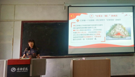 纪安玲围绕“中国共产党百年辉煌历史”“安康红色故事——红军老祖”“红军老祖故事的现实启示”三个方面带领同学全面回顾党的光辉历程,深切缅怀革命前辈和英雄人物,激发同学们爱党、爱国之情。在讲座中,纪安玲号召同学们学习践行中国共产党在各个时期的伟大精神:红船精神、脱贫攻坚精神、抗疫精神等。之后她为同学们提出了以下几点希望:一是要加强学习;二是要矢志不渝,三是要恪尽职守。