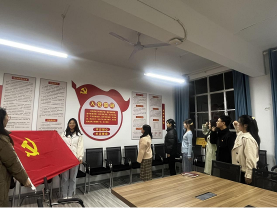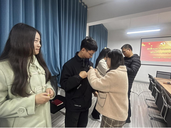 入党宣誓仪式开始前,正式党员杨高翔、刘佩为每位新发展党员佩戴党员党徽。随后,刘佩同志带领着全体新发展党员面向党旗、右手举拳,庄严宣誓:“我志愿加入中国共产党,拥护党的纲领,遵守党的章程……为共产主义奋斗终身,随时准备为党和人民牺牲一切,永不叛党。”铿锵有力的宣誓声表达了新发展党员们对党的无限忠诚和为共产主义事业奋斗终身的坚定决心。