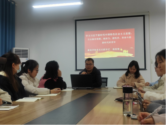 继续深入开展主题教育,提升党员党性修养,筑牢积极分子、发展对象的政治理论基础,数学与统计学院党总支副书记讲党课暨第56期积极分子、 27期发展对象培训动员会11月15日在2号教学楼2207室开展,数统学院党总支副书记杨高翔以“学习习近平新时代中国特色社会主义思想,立志做有理想、敢担当、能吃苦、肯奋斗的新时代好青年”为题,为学生支部全体党员、第56期入党积极分子和第27期发展对象讲党课。