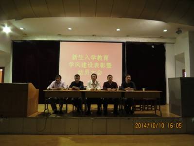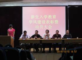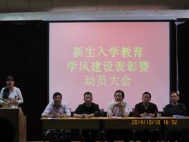 10月10日下午,我系在1号教学楼6楼报告厅召开了2013-2014学年学风建设表彰暨2014-2015学年学风建设动员大会。参加会议的有系主任赵临龙,党总支书记郭全寿,系副主任王昭海、汪义瑞,系学工办主任马新华,团总支书记张远秀,教学秘书师帅,省级教学能手王秋芬老师,2014级班主任武海辉、张永亮、王成以及2014级全体新生。会议由马新华主持。