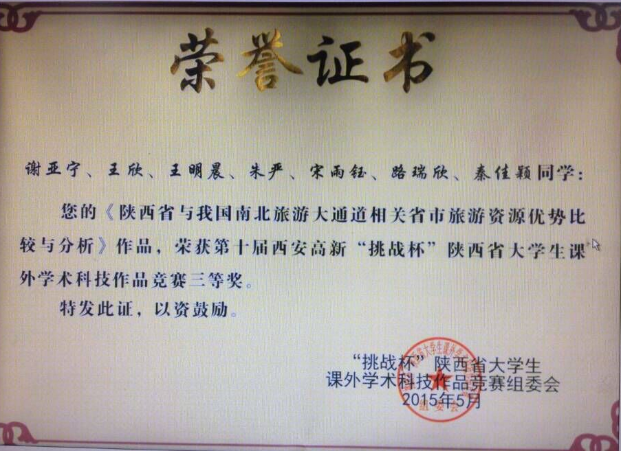 此次竞赛历时三个多月,经过我校专家评审,校内决赛秘密答辩等环节,数统系有2件作品被选送参与全省联评。在赵临龙、张远秀老师指导下,谢亚宁、王欣 、王明晨、 朱严、 宋雨钰、 路瑞欣、 秦佳颖同学的作品《陕西省与我国南北旅游大通道相关省市旅游资源优势比较与分析》荣获三等奖。