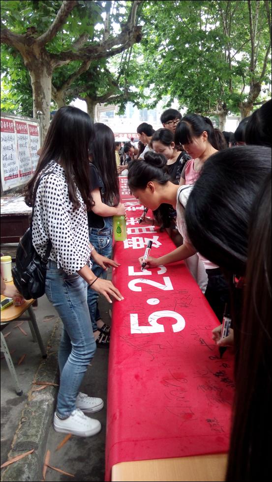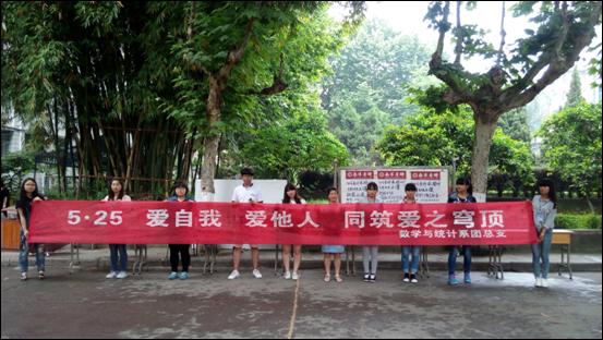 2015年5月25日,在第16个大学生心理健康日到来之际,数学与统计系在江南校区林荫道开展“爱自己,爱他人,同筑爱之穹顶”签名仪式暨“心灵嘉园”寄托心语活动。活动由系团总支、学生分会组织开展。