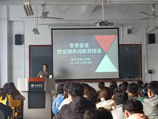为有效防范安全事故发生,提高同学们的安全防范能力,全面普及校园安全常识,创建平安美好校园。2020年11月18日至25日,数学与统计学院各班召开冬季安全教育班会,班会由辅导员董婷瑜、刘佩分别主持。