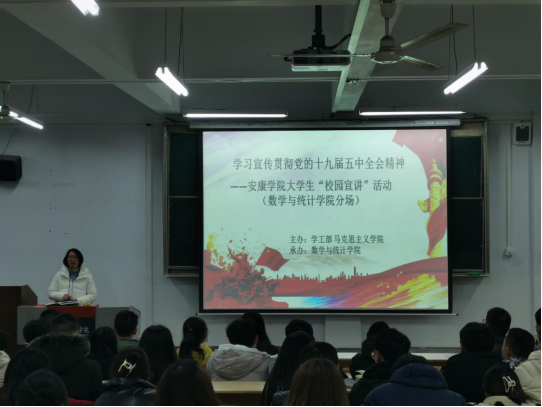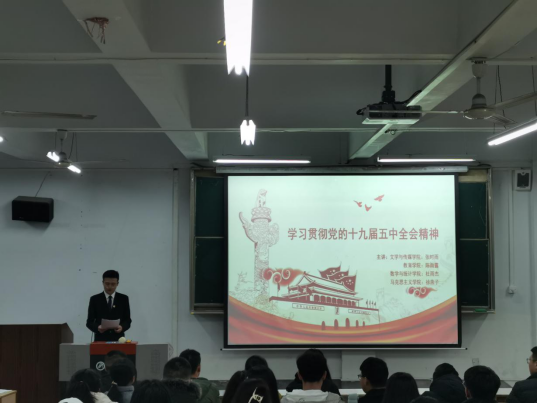 为深入学习宣传贯彻党的十九届五中全会精神,帮助广大学子进一步增强“四个意识”,坚定“四个自信”,做到“两个维护”,12月23日,由学工部、马克思主义学院主办,数学与统计学院承办的学习宣传贯彻十九届五中全会精神大学生宣讲活动在1510举行,数学与统计学院党总支书记郭全寿、副书记杨高翔、辅导员、全体学生干部、入党积极分子、发展对象、学生党员共计一百五十余人进行了学习,宣讲由学工办主任董婷瑜主持。