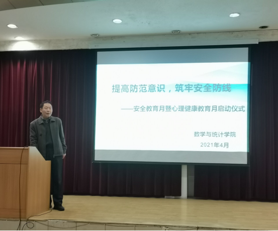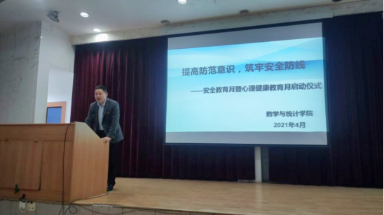 为进一步强化学生的纪律观念,提高学生的防范意识和自我保护能力,保障学生人身和财物安全,促进学生健康成长, 数学与统计学院联合保卫处开展安全教育月系列活动。数统学院安全教育月暨心理健康文化节启动仪式在一号教学楼六楼报告厅举行,保卫处处长王开忠、数统学院党总支书记郭全寿,数统学院副院长成波、保卫处王波、辅导员刘佩、学生代表参加了启动仪式,启动仪式由学工办主任董婷瑜主持。