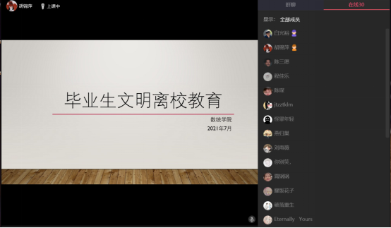 为确保毕业生文明离校、温暖离校,营造和谐文明的氛围,数学与统计学院各班召开毕业生离校教育班会。