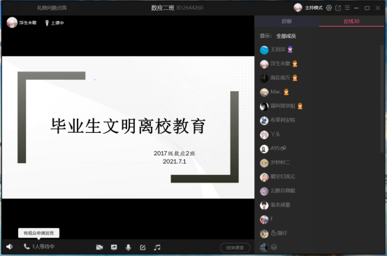 6月30日,毕业班辅导员董婷瑜、刘佩召集在校班委传达了学校关于离校教育的相关通知精神,对离校手续办理、毕业相关材料的领取进行了详细的解释,接着从往返安全、文明离校、加强自我约束、诚信感恩、疫情防控等各方面对毕业班提出要求。7月1日-4日,毕业班各班召开线上班会,班委带领学生认真学习了《关于做好2021届毕业生文明离校教育工作的通知》,要求大家文明离校,号召同学们心怀感恩,展现我院学生良好的精神面貌。