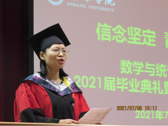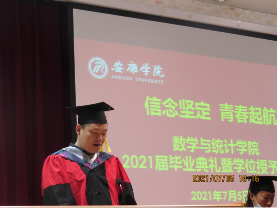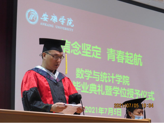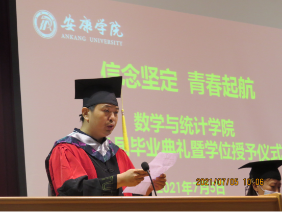 副院长杨高翔宣读毕业生与学士学位授予名单,其中数学与应用数学专业学生105名,统计学专业学生74名授予理学学士学位。副院长徐龙华宣读陕西省优秀毕业生、陕西省优秀学生干部、安康学院优秀毕业生获评名单。