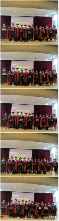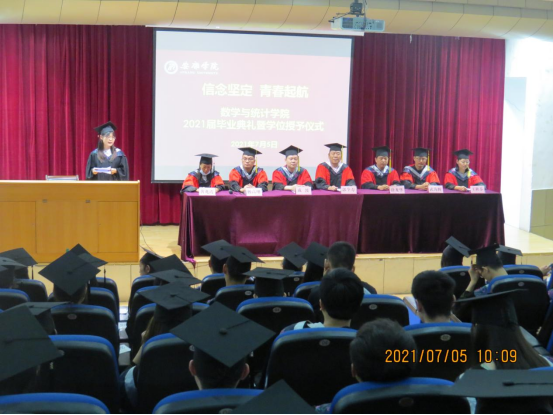 7月5日上午,数学与统计学院2021届毕业生毕业典礼暨学位授予仪式在一号教学楼六楼报告厅隆重举行。数统学院党总支书记郭全寿、副院长成波、副院长杨高翔、副院长徐龙华,数学系主任武海辉,教师王秋芬、黄兆霞、毕业班辅导员、2021届毕业生参加了典礼,毕业典礼由郭全寿主持。