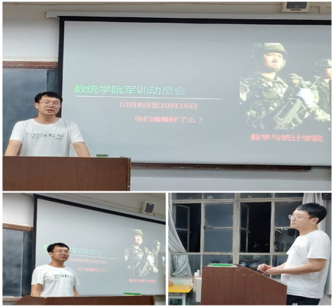 在这个秋风飒爽,丹桂飘香季节里,数学与统计学院辅导员马勇于9月29日晚上七点半在2203教室分批对2021级新生进行了军训动员会。
