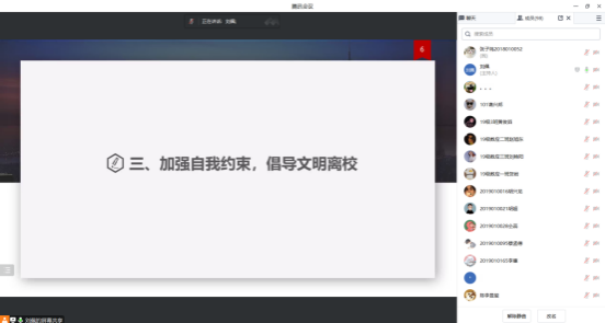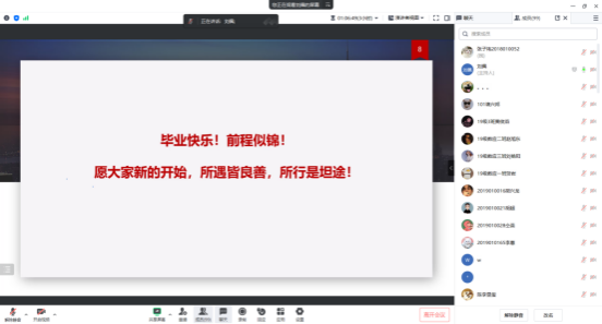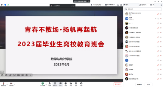 为做好毕业生的教育、引导、服务工作,确保毕业生安全、文明、顺利离校,数学与统计学院于2023年6月27日通过线上腾讯会议的方式召开了2023届毕业生离校教育班会,会议由毕业班辅导员刘佩主持,全体毕业生参与。