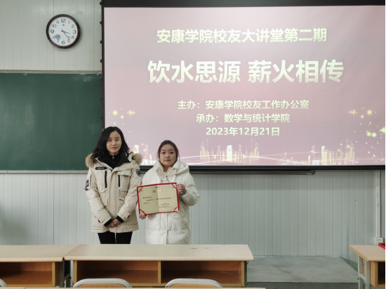 张远秀鼓励同学们向优秀校友学习,充实度过大学生活,为社会做贡献,反哺母校,饮水思源,薪火相传。最后,张远秀为董奕驰颁发了安康学院就业创业导师聘书。