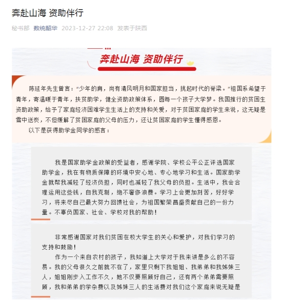 ——推送资助育人感言。受助学生抒发感言,表达心中所思所想,特别是对于国家、学校的感恩之情和奋发决心,学院在公众号进行整理推送,激发了学生尤其是家庭经济困难学生不畏困难、积极向上、奋发学习、自强自立的精神风貌。