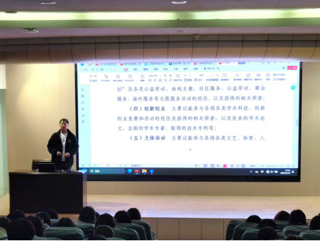 团总支书记马勇,详细介绍了学校的第二课堂学分的分布与可获得学分的各类活动,表明第二课堂学分制的实施旨在培养具有创新精神、实践能力和社会责任感的高素质复合型人才。鼓励大家自主选择、积极参与,实现知识学习与实践能力培养的有机融合,促进自身的全面发展。