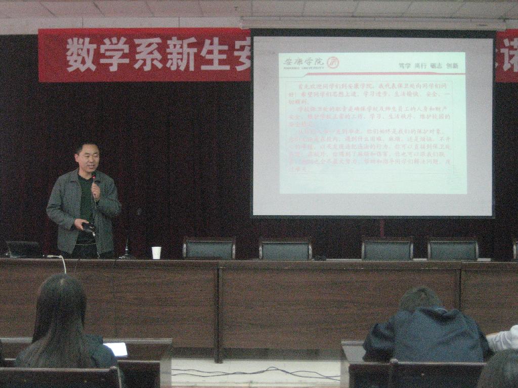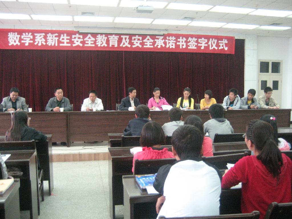 9月29日下午,数学系在图书馆六楼报告厅举行了2011级新生安全教育及学生安全承诺书签字仪式。参加仪式的有保卫处处长高立平、党总支书记李延福、保卫处副处长王开忠、学工办主任马新华、辅导员肖红香及2011级全体新生。仪式由马新华主持。