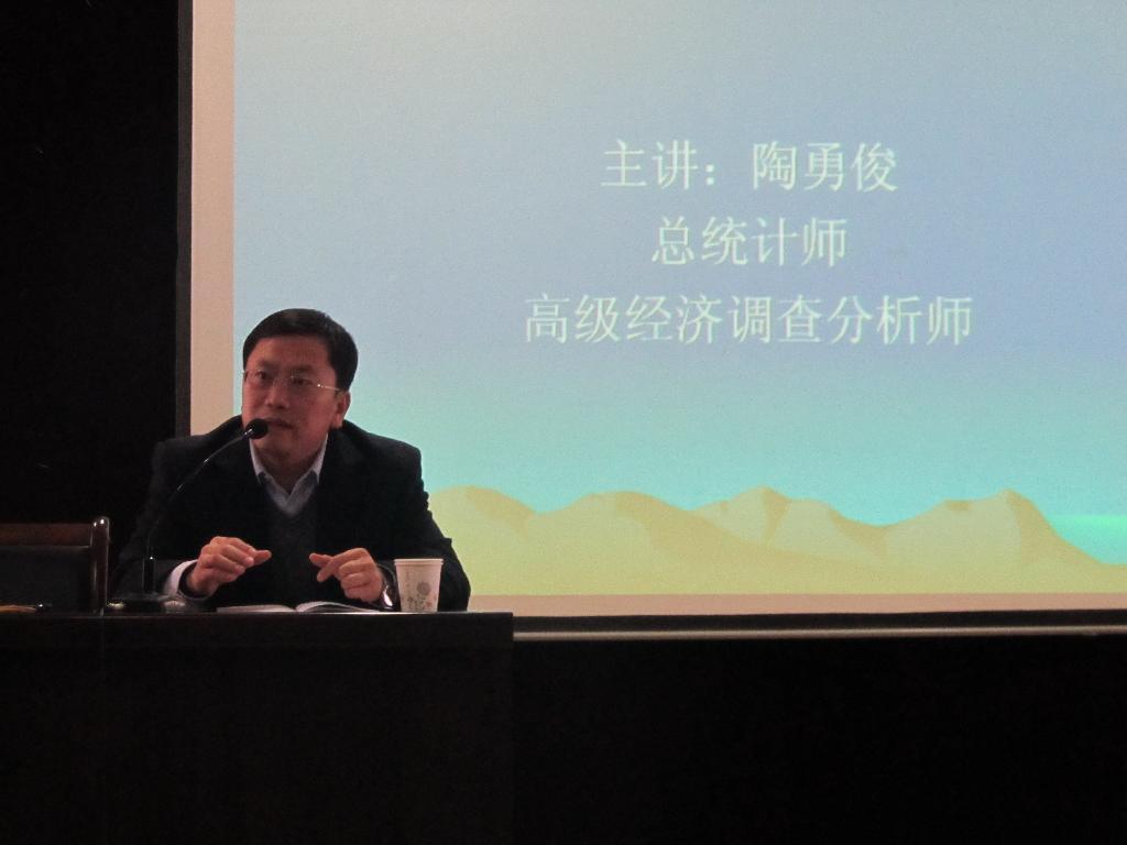 2011年11月18日下午3:00安康市统计局总统计师、高级经济调查分析师、安康市社会经济调查中心主任、统计从业资格培训主讲教师陶勇俊应邀在我院1号教学楼6楼报告厅陶总统计师为我系统计专业教师及学生做了题为:“学精统计知识,锻造走向社会能力”的学术报告。数学系主任赵临龙教授主持报告会,数学系100多名师生聆听了报告。