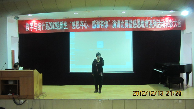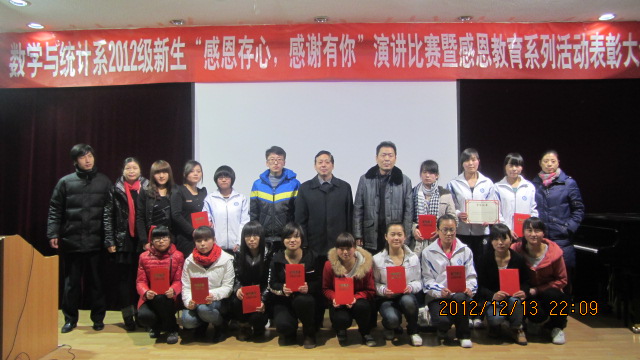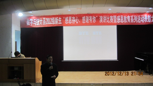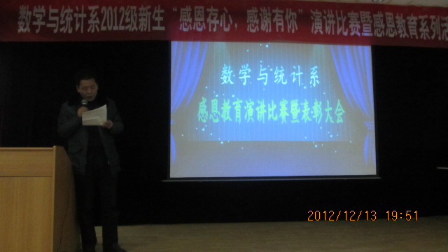 12月12日晚,数学与统计系在1号教学楼6楼报告厅举行2012级新生“感恩存心 感谢有你”演讲比赛暨感恩教育系列活动表彰大会。系党总支书记郭全寿,系主任赵临龙,系办主任何晓燕,教师代表汪明星,系团总支书记、辅导员肖红香及学生会全体成员、参赛选手、2012级全体学生参加了本次活动。