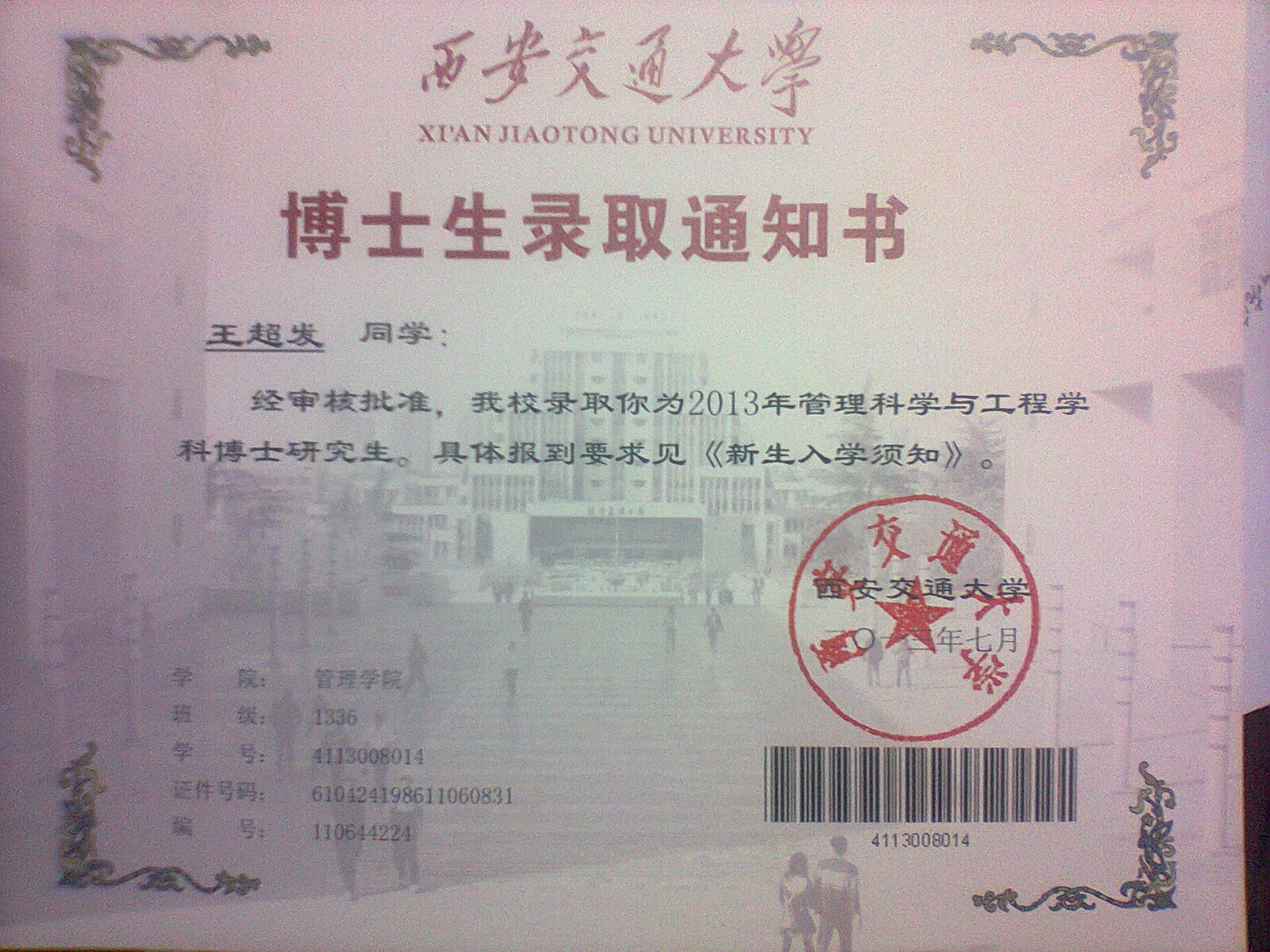 “数学与应用数学”专业首届毕业生王超发考取西安交通大学博士研究生
