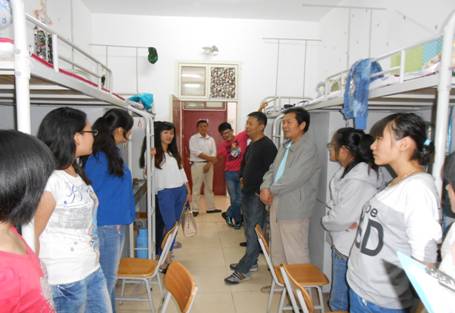 和蔼可亲的郭老师与新同学们拉家常,让初来乍到的新同学们感受到了浓浓的温情。副主任汪老师仔细询问同学们在新环境下的生活情况。辅导员张远秀嘱咐同学们,天气渐冷要注意饮食穿衣。马老师了解了新生的家乡情况,特别对部分外省学生倍加关注。学生会干部以学长的身份亲切的介绍了大学生活和学习情况,告诉新同学要积极适应。大家离开公寓已近10:00。