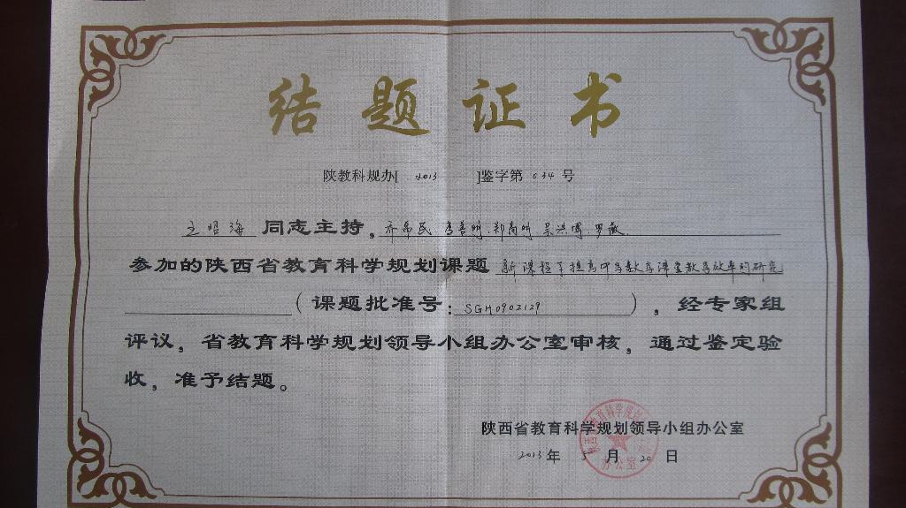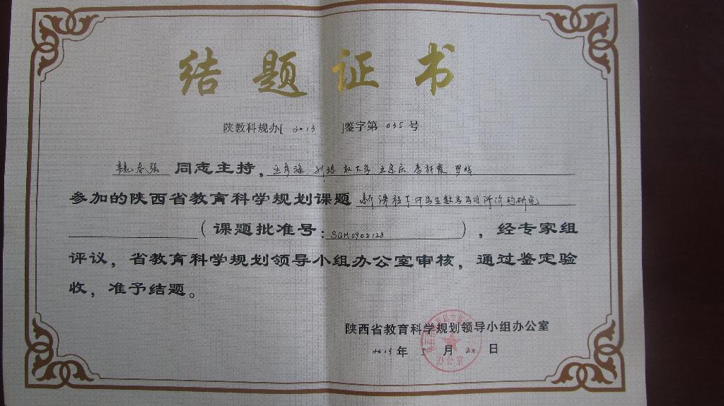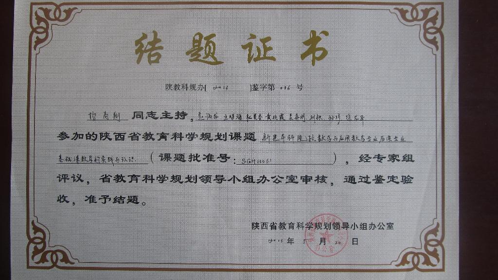 另外,我系教师王昭海、魏春强、杨高翔分别承担的省教育科学“十一五”规划课题《新课程下提高中学数学课堂教学效益的研究》(SGH0902129,王昭海)、《新课程下中学生数学学习评价的研究》(SGH0902128,魏春强)、《新建本科院校数学与应用数学专业后续专业基础课教学的实践与认识》(SGH10061,杨高翔)也通过鉴定验收,结题。