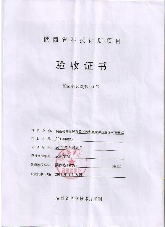 我系主任赵临龙教授承担的陕西省科技计划研究项目《陕南循环发展背景下的安康旅游业发展对策研究》(课题编号2011KRM25),顺利通过科技厅的验收评审。