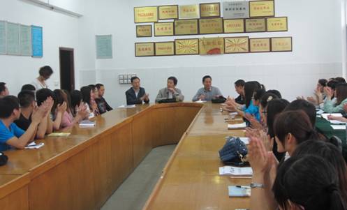二、讨论交流:课后,授课老师与见习学生在迎风九年制学校会议室进行了座谈交流。座谈会由李善明老师主持,首先由授课老师们就所上课的课型、教学重难点、学生状况、教学目标、教学过程安排等问题作介绍,然后就备课,上课,课堂组织管理,课堂交流等同学们关心的问题进行了交流。交流会气氛热烈,问题不断,该校校长张祥森,教导主任夏发财就中学教师的德、能素质作了阐述,见习学生深受启示。最后郭全寿、汪义瑞代表数学与统计系对迎风九年制学校为此次教育见习实践活动提供的大力支持表示衷心地感谢。并要求见习学生整理好听课记录,认真总结,虚心求教,为见习试讲、教育实习等实践环节积累经验。