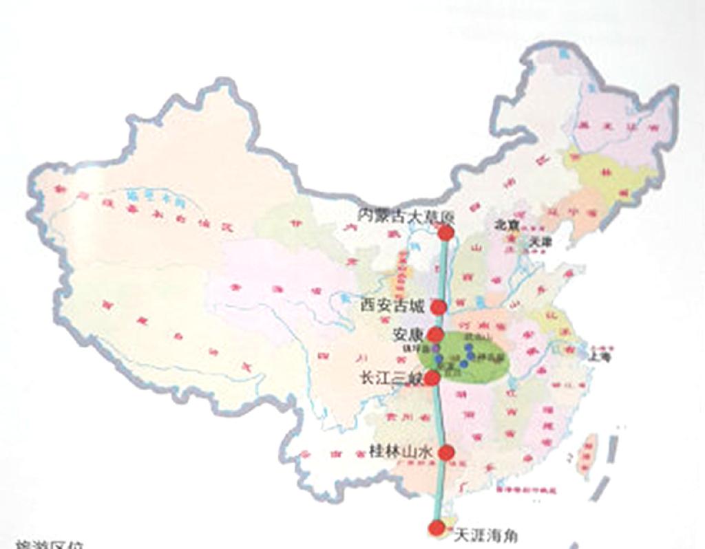 我国中西部南北旅游大通道,是指位于东经110℃的我国南北中轴线附近,涉及我国中西部的8个省、自治区、直辖市:内蒙古、陕西、重庆、湖北、湖南、广西、广东、海南,全长3千多公里。这条南北旅游大通道荟萃了世界级的旅游精品:内蒙古的成吉思汗陵、陕西的黄帝陵、兵马俑及西安古都景观、重庆和湖北的三峡、湖南的张家界、广西的桂林山水、海南的天涯海角。南北旅游大通道除西安市和海口市两个省会城市外,都是地处我国中西部结合处的经济欠发达地区的地级市,其面积和人口分别占到全国的6.1%和5.7%。这条南北旅游大通道是西部地区发展旅游促进区域经济发展的致富线,对于形成我国(东)中西部地区的南北经济带有着重要意义。