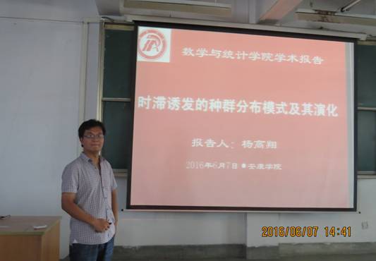 6月7日下午2:30在1号教学楼1510教室,杨高翔博士应邀为我院师生做了题为 《时滞诱发的种群分布模式及其演化》的报告。该报告主要以种群个体相互作用的时空滞后效应为主线,报告了时滞因素对种群的分布模式及其演化的影响,特别是对维持种群的稳定性具有重要意义的非均匀分布的影响,其结果具有重要的理论意义和应用价值。